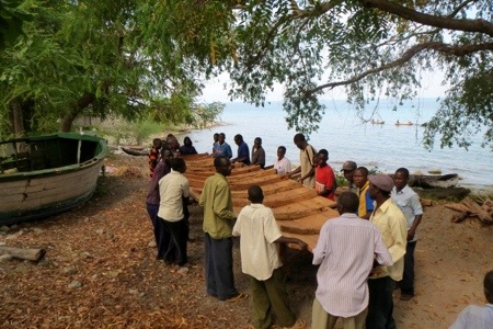 Die ziehen das Netz zwischen zwei Einbäumen ein Stück weit übern See und zerren es anschliessend an Land.