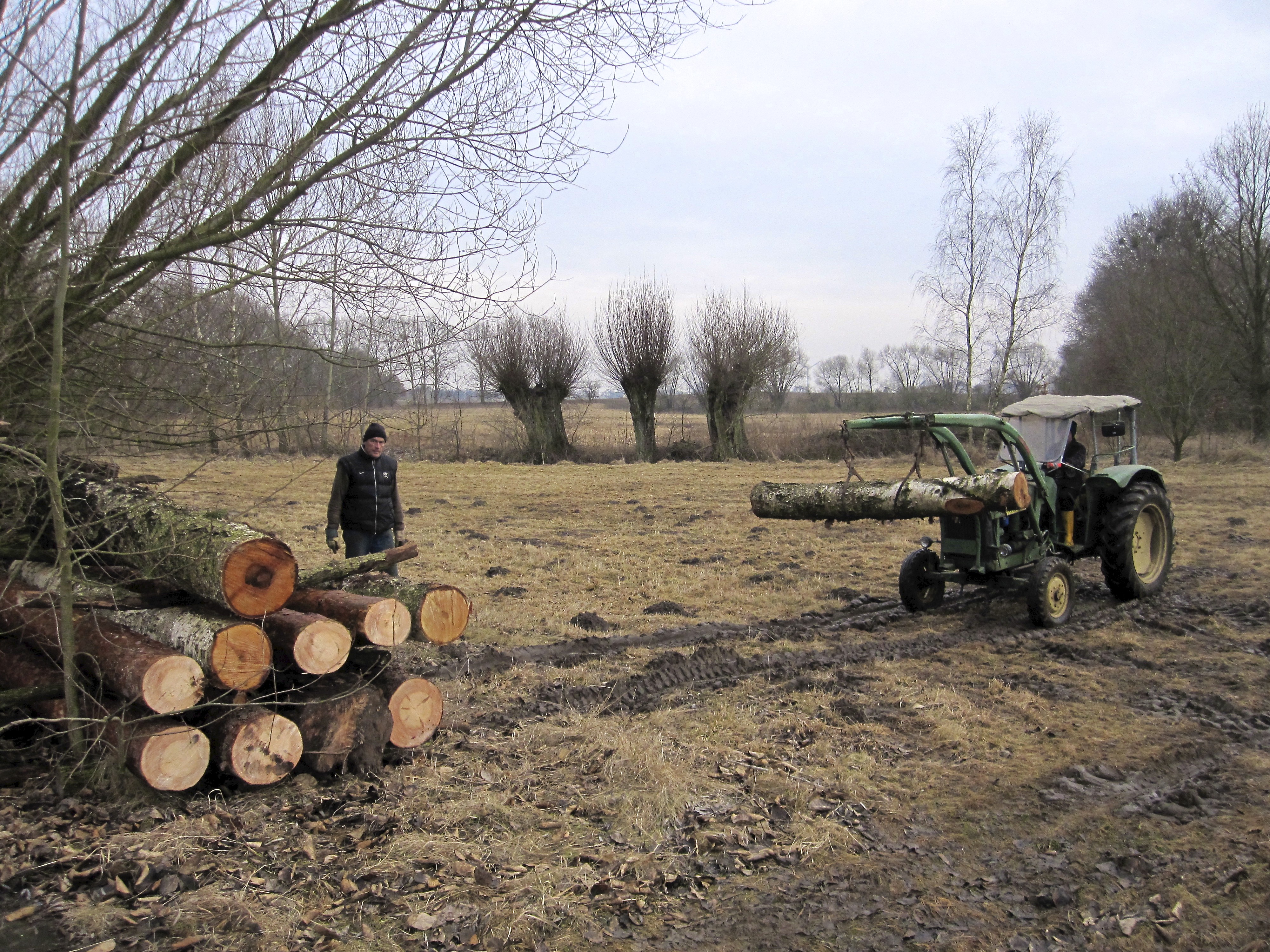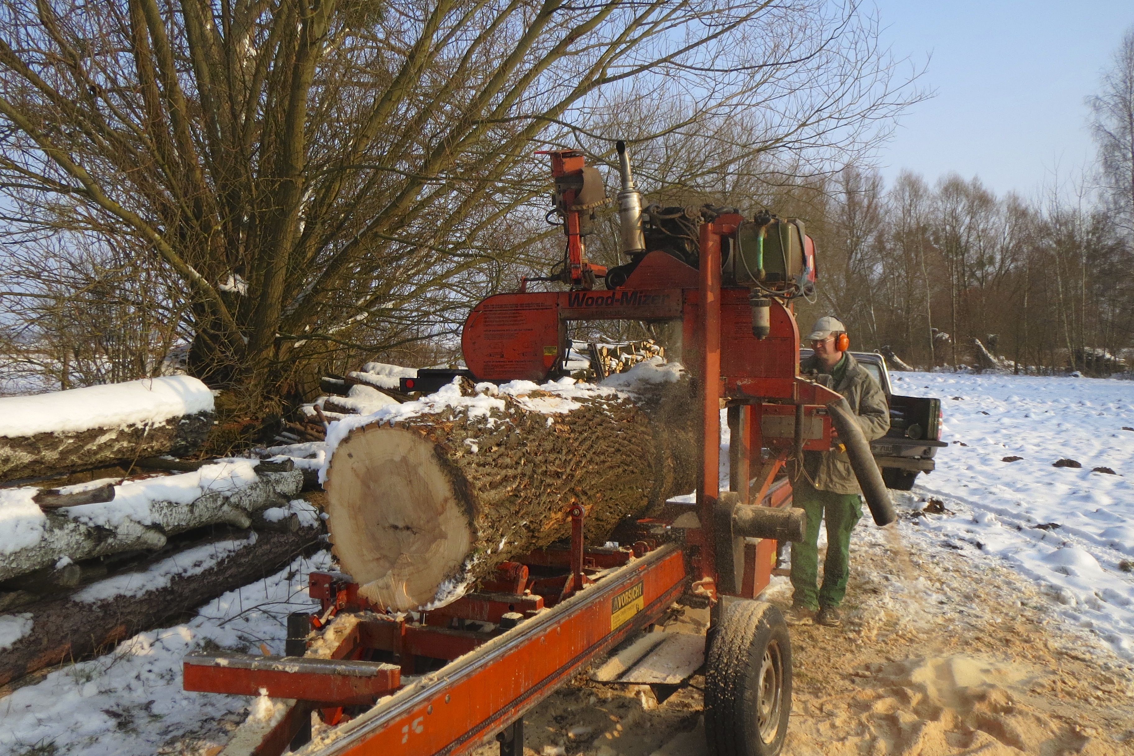 Drei mal haben wir eine mobile Blockbandsäge bestellt und so einen Vorrat an Holz angelegt. Überwiegend Kiefer, aber auch etwas Birke und Esche.