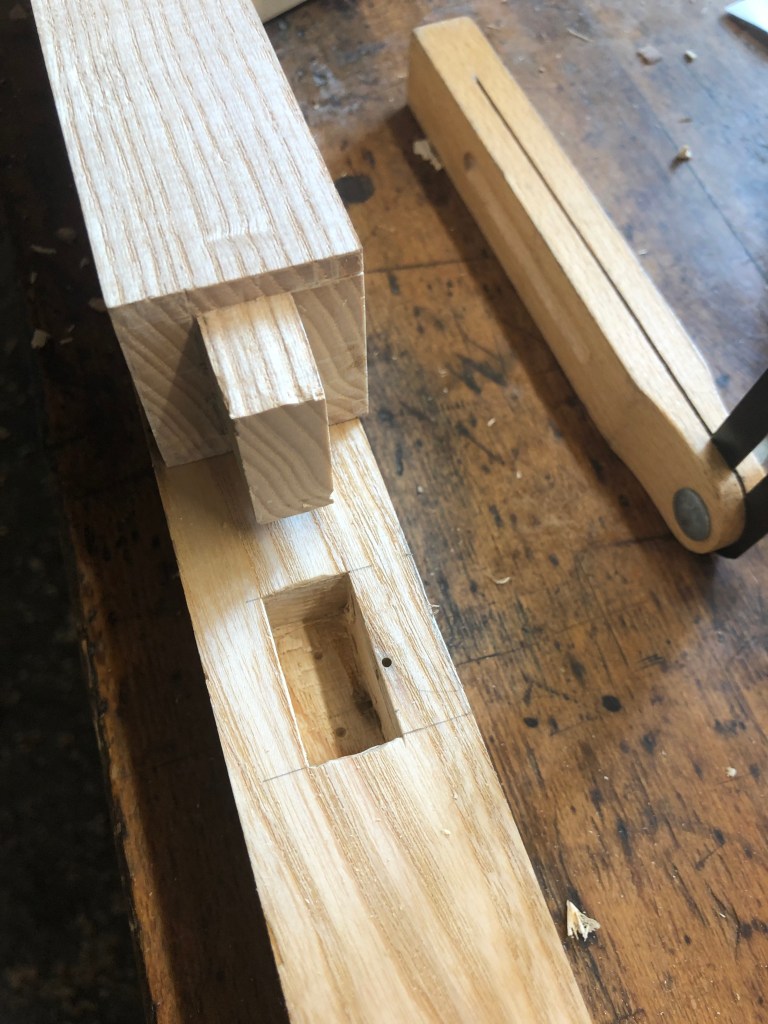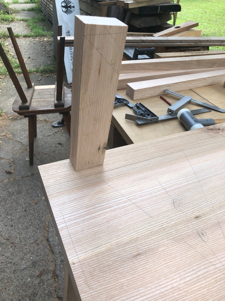 Und ja: beim Stuhlbau passieren immer wieder Fehler. Winkel hier, Winkal da und immer auf die Bezugskante achten! Hier sieht man einen Lamello (Flachdübel) der beim Ausarbeiten der Sitzfläche das Tageslicht entdeckt. Das ist jetzt schon zwei mal passiert. Wenn ich die Sitzflächen anders herum positioniert hätte (wie beabsichtigt), wäre das nicht passiert. Dann wären die Dinger unterhalb der Mitte. So war das nicht gedacht! Immer noch einmal nachdenken und noch wichtiger: markieren!
