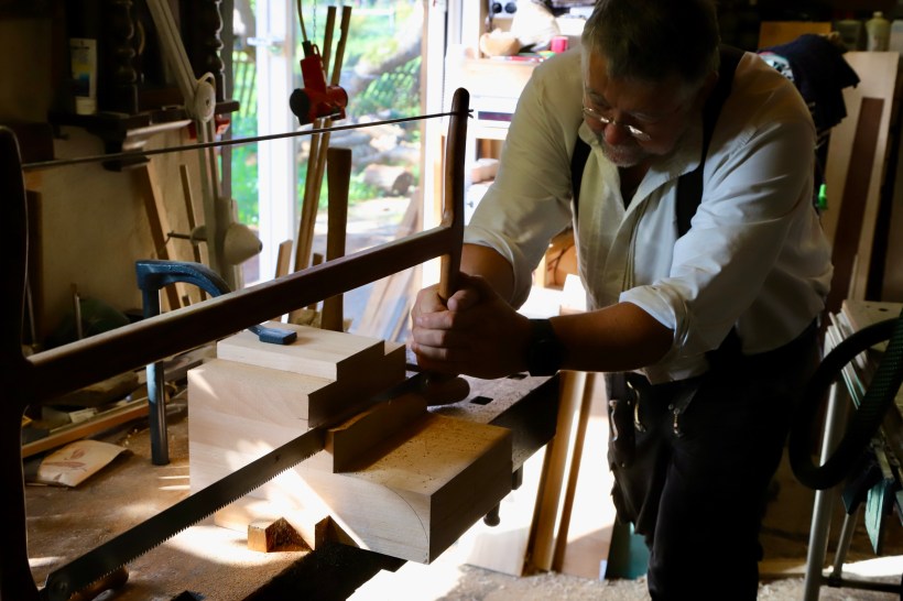 Den Block im oberen Abschluss der Säule haben wir zwischenzeitlich an den „Kubismus“ angelehnt und aus vier Teilen zusammen geleimt. Anschließend dann mit Säge, grossem Hohlbeitel und Hobeln in Form gebracht.