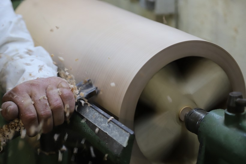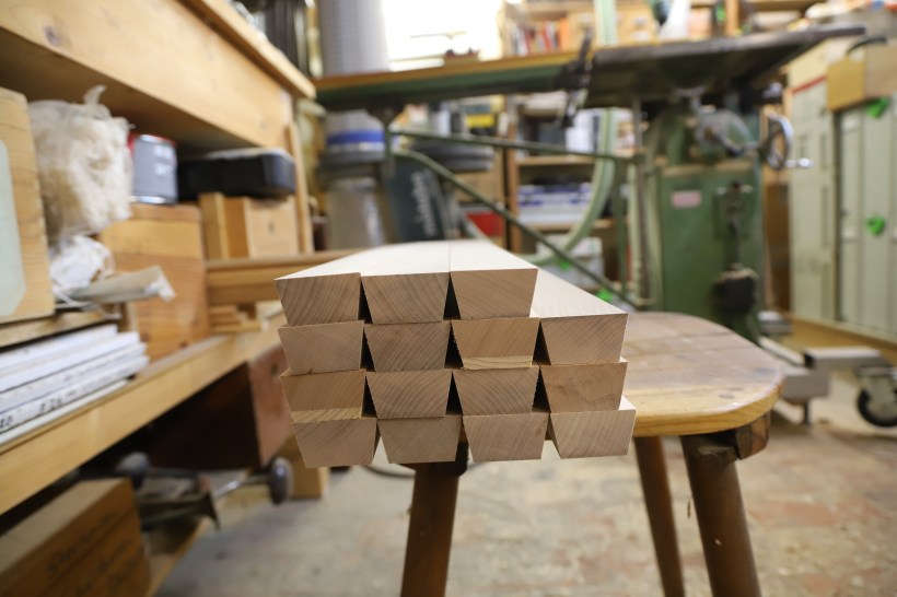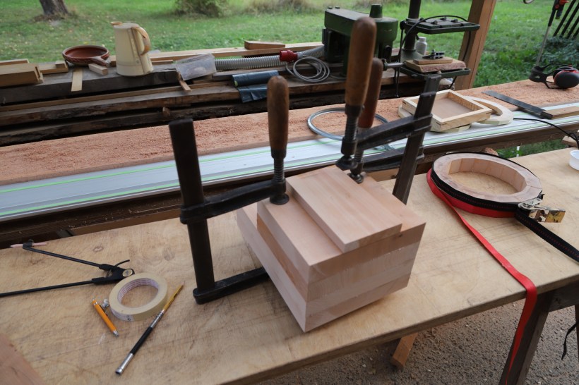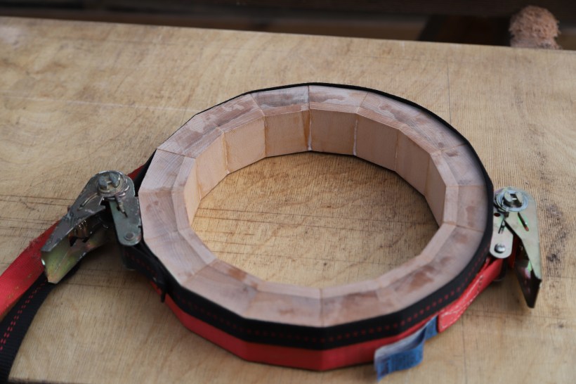 Also wurde gerechnet und beschlossen Ring und Säule jeweils aus 16 Segmenten zusammen zu leimen. An dem Ring konnten wir üben. 360 Grad dividiert durch 16 macht 22,5 Grad. Wenn man nur ein Zehntel Grad abweicht, summiert sich das auf eine Grösse, die nicht tolerabel ist, Spalten werden sichtbar. Nach zwei Versuchen mit Probestücken passte das.