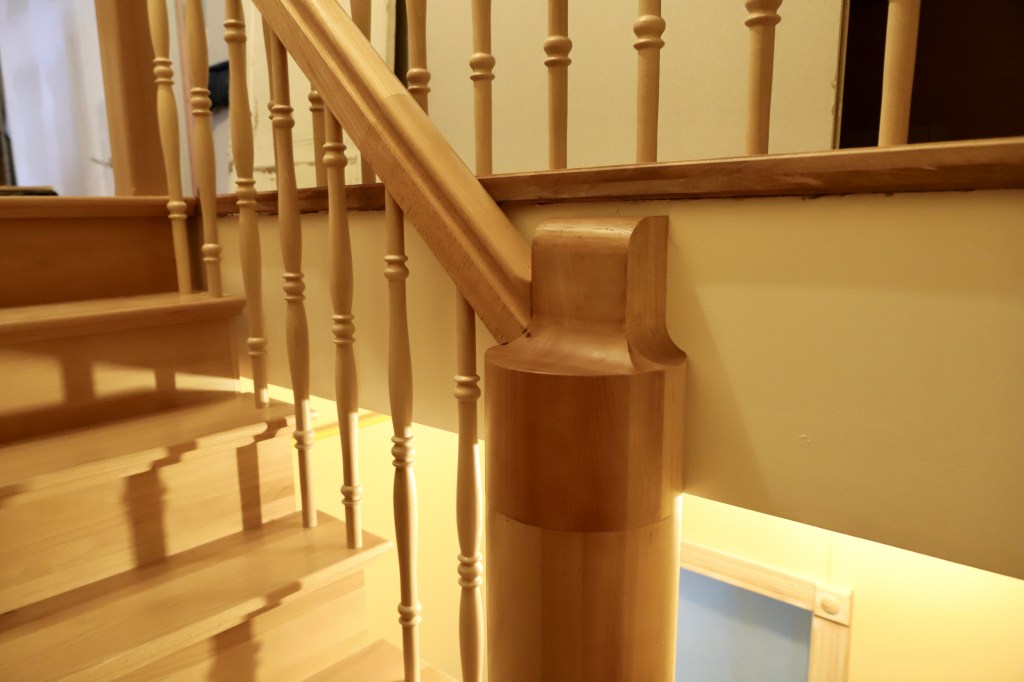 Zwei sehr massive Handläufe waren schnell hergestellt, es brauchte noch eine Sockelleiste und einen Pfosten. Das Drechseln der 22 Staketen konnten wir – Gott sei Dank! – auslagern. Der herausfordernde Part war die Vervollständigung einer mitten im Raum endenden Säule, um die sich die Treppe windet. Um den vorhanden Teil mit dem neuen zu verbinden musste ein „Überwurfring“ her und die Säule selbst brauchte oben einen Abschluss aus Vollholz, der an dem historischen Vorbild zu orientieren war. An diesem Teil musste einer der beiden Handläufe angearbeitet werden.