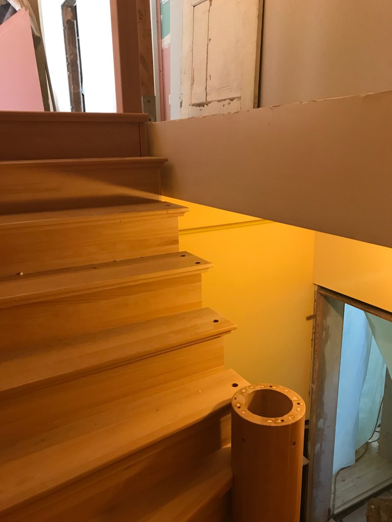 Ein Malermeister im Ruhestand hat eines der Häuser gekauft und angefangen es zu sanieren. Nach unserem Eindruck macht er das schon einige Jahre. In Polen hat er eine neue Treppe aus Buche bestellt. Nach Fertigstellung und Einbau von ca. 90 Prozent hat er sich – so unsere Vermutung – mit den Auftragnehmern überworfen. Zumindest suchte er Leute, die das fertig stellen konnten. Mit dem von Zeit zu Zeit bei mir arbeitenden Johannes haben wir nach der Besichtigung erst einmal lange überlegt, dann doch ein Angebot abgegeben und nach Annahme des selben mit der Fertigung begonnen.