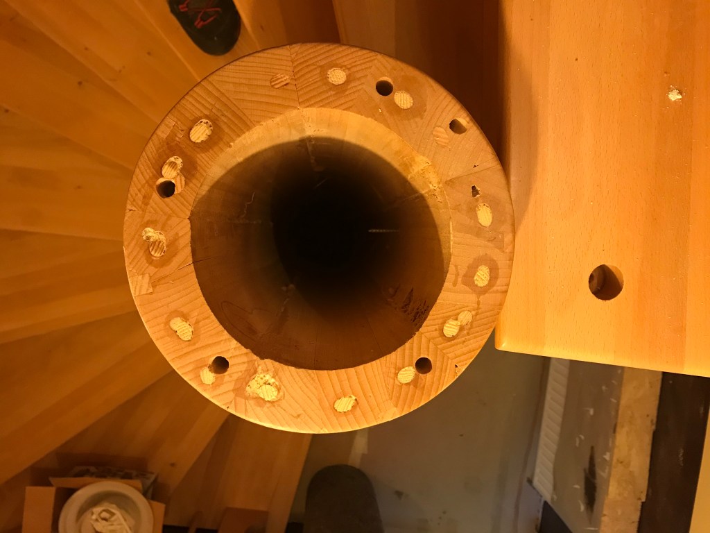 Der Ring war auf der Drechselbank einfach zu bearbeiten. Aber wie spannt man eine hohle Säule von einem halben Meter? Die Lösung bestand aus zwei eingeleimten Kreuzen durch deren Mitte ein Rundstab gebohrt wurde, mit einem Dübel gegen Verdrehen gesichert. Die Fotos erklären das.