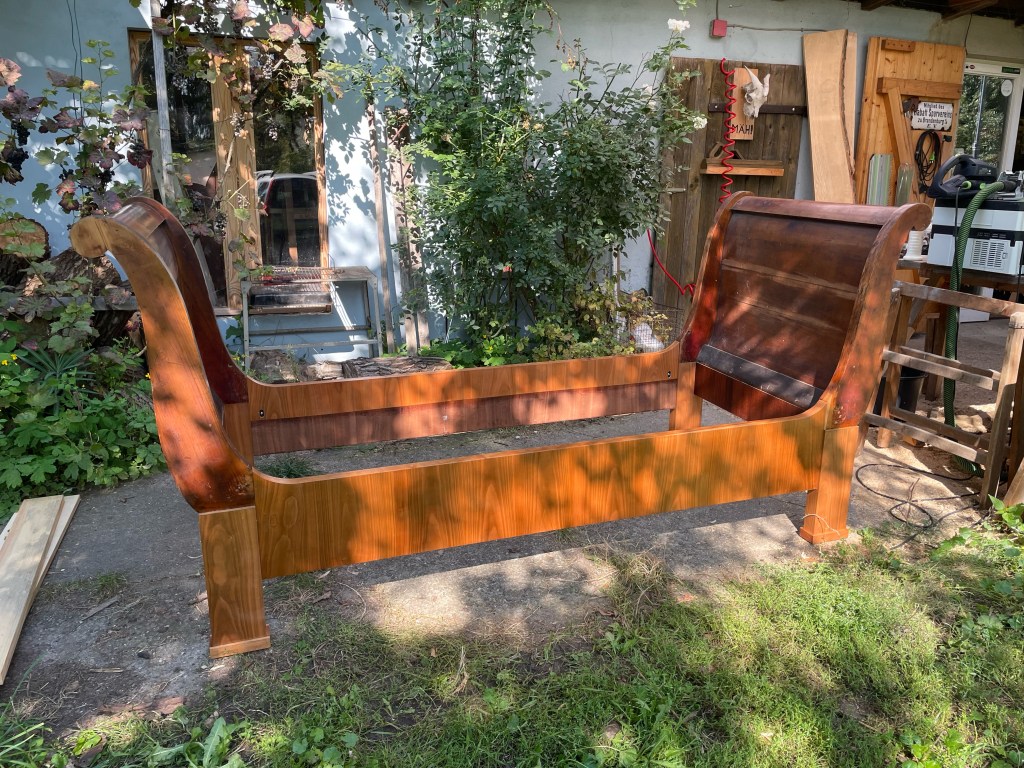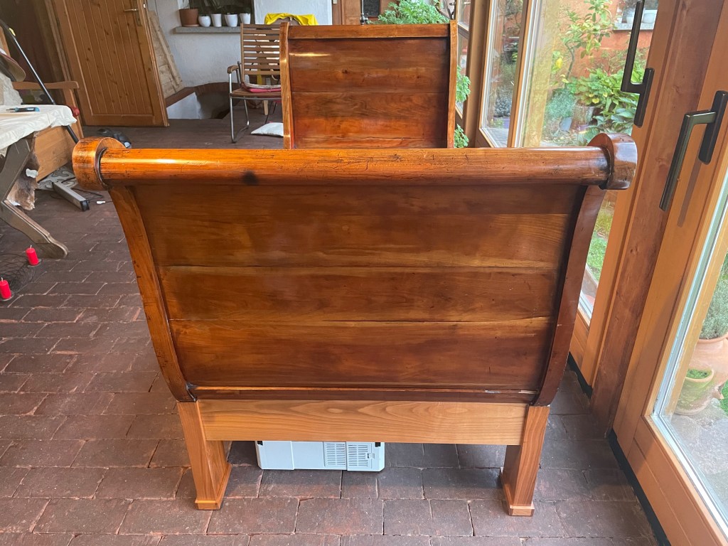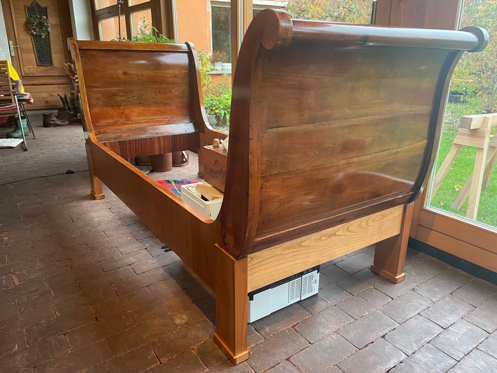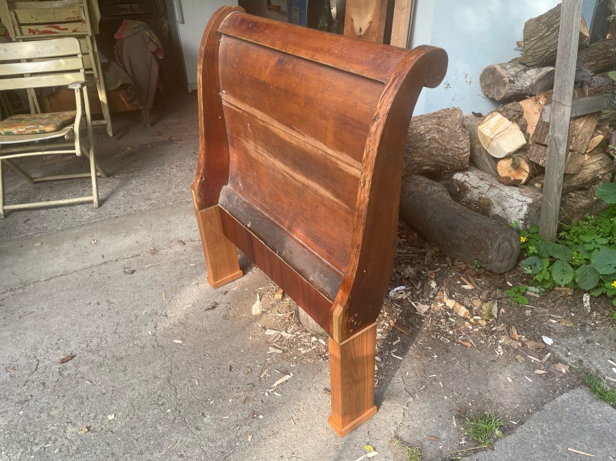 Manchmal geht etwas verloren. Hier aber eine ganze Menge. Zwei Teile eines Biedermeierbettes sind noch vorhanden. Kopf- und Fussteil haben unten jeweils Zapfen, waren also an einem weiteren Fussteil befestigt. Aus den Seitenteilen soll sich ein Familienmitglied mal Regale gebaut haben, was dieser bestreitet – wie das manchmal so ist…