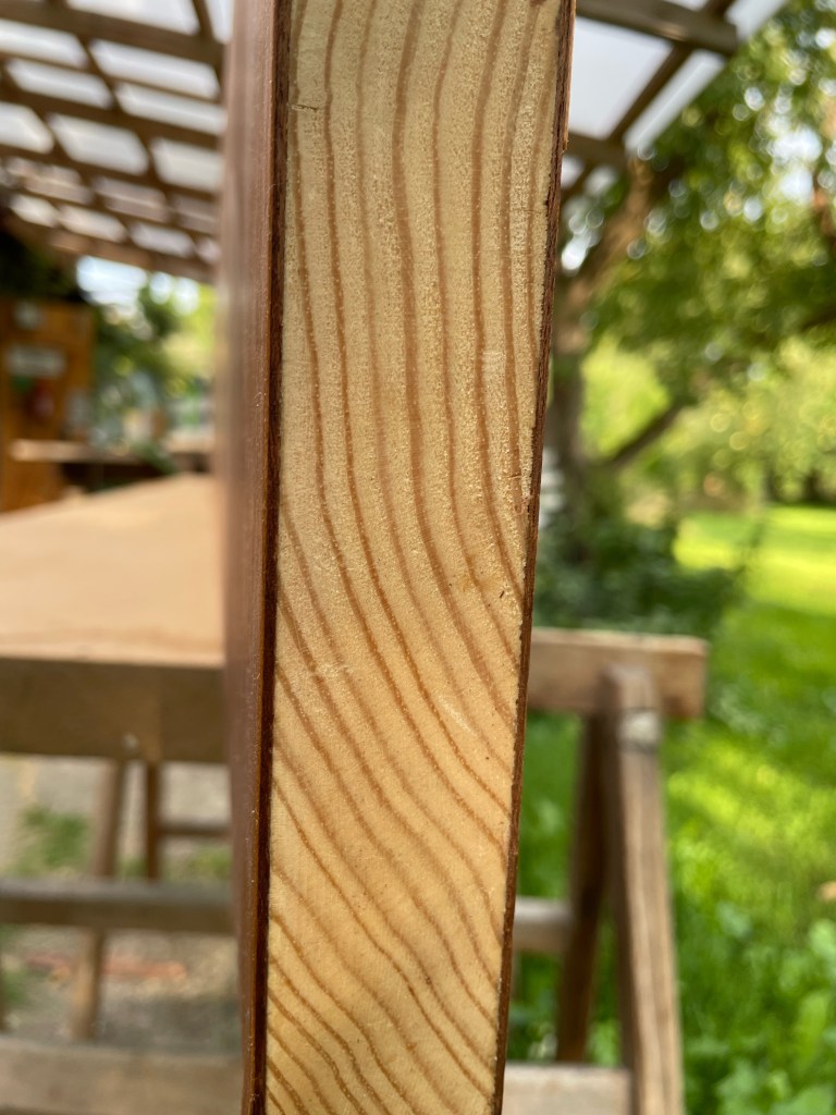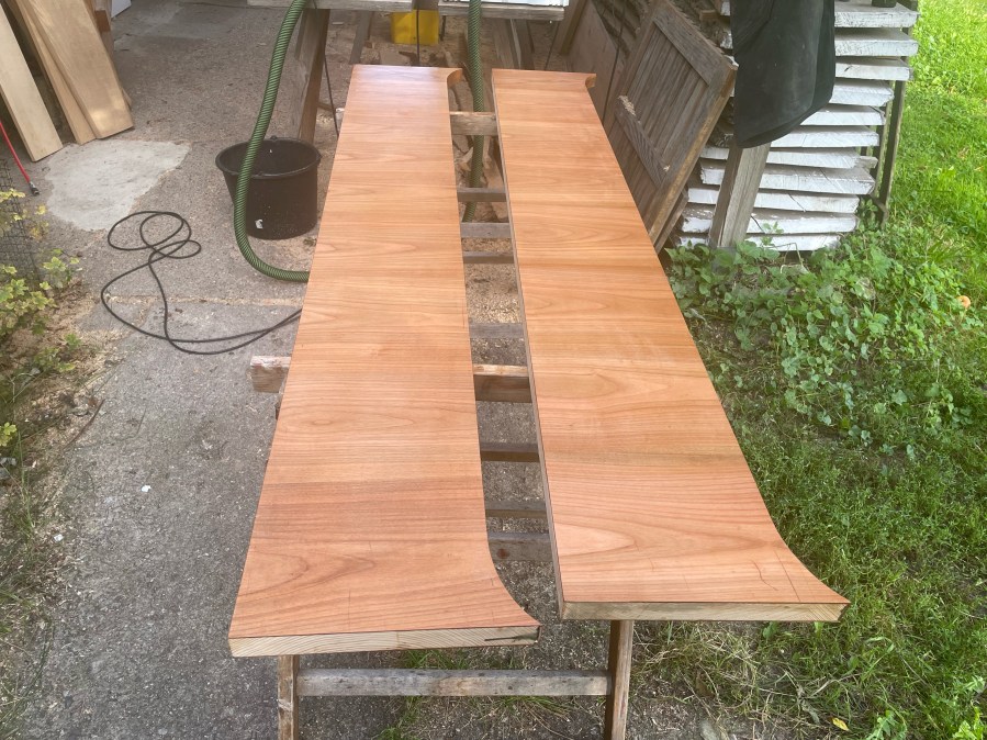 Das neue Kirschfurnier ist natürlich viel heller. Ich habe darauf verzichtet es zu färben. Mit den Jahren wird sich das auf natürliche Weise angleichen. Lediglich die Querholzdübel an den Kopfenden habe ich etwas retuschiert.
