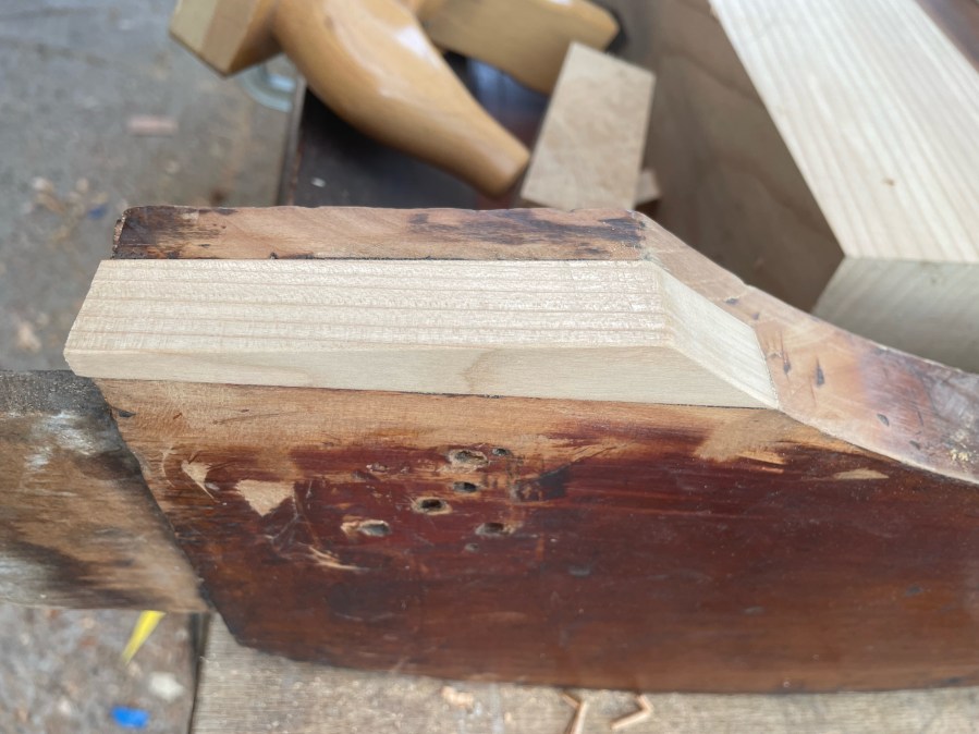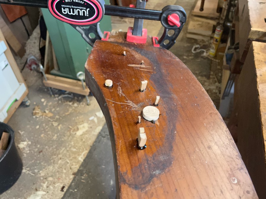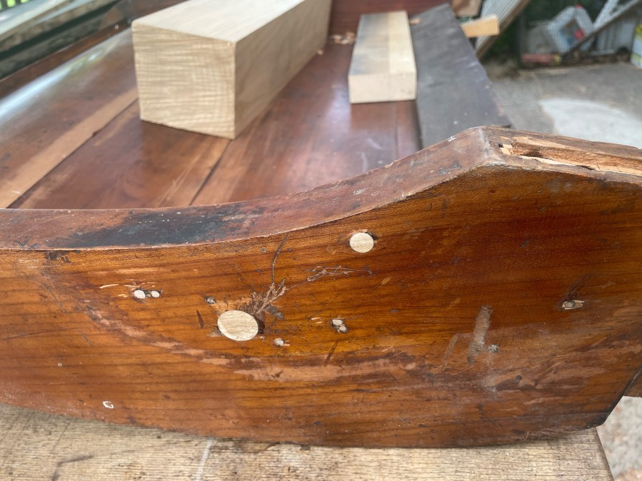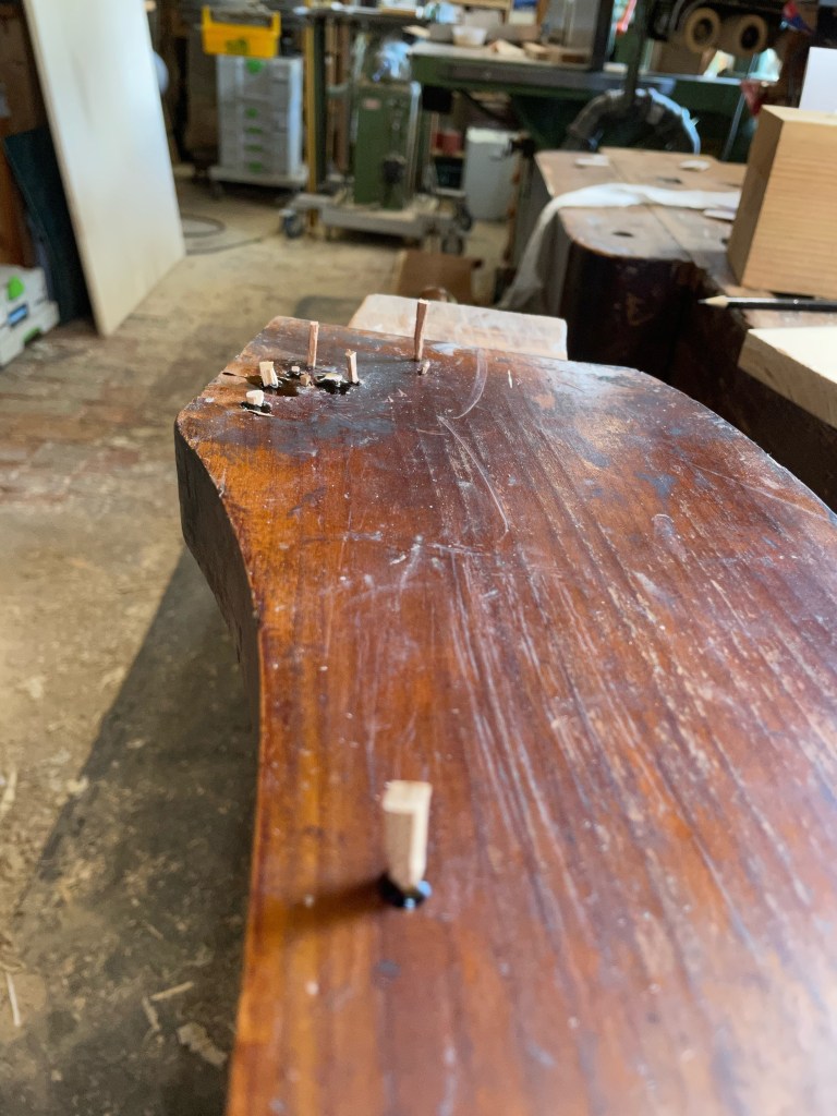 In den Seitenwangen der Kopfteile waren viele Löcher! Keine Ahnung, was da schon alles angeschraubt und -genagelt war. Die grösseren habe ich mit querholzdübeln, die kleineren mit geschnitzten Holznägeln aus Kirsche verschlossen. Innen habe ich den Aufwand nicht betrieben.