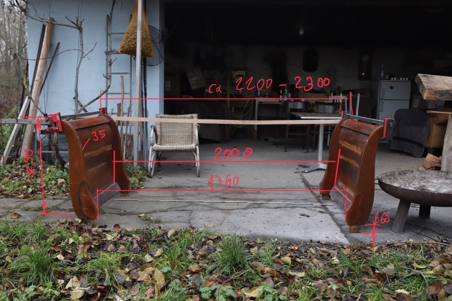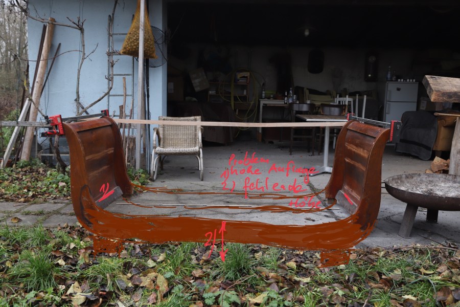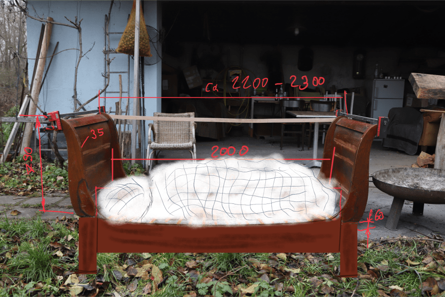 Das Bett soll also wieder nutzbar gemacht werden. Auf der ersten Skizze sieht man meine Überlegung die Kopfenden an die Seitenwangen „heran zu führen“. Da aber eine nötige Stabilität dadurch kaum zu gewährleisten wäre und ich die vorhandenen Zapfen nutzen wollte, musste eine andere Lösung her. Auch soll das Bett eine vernünftige Sitzhöhe bekommen um auch als Sitzmöbel genutzt werden zu können.