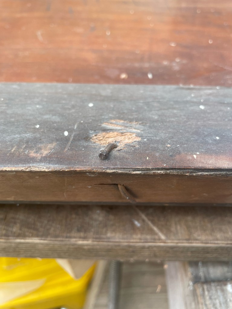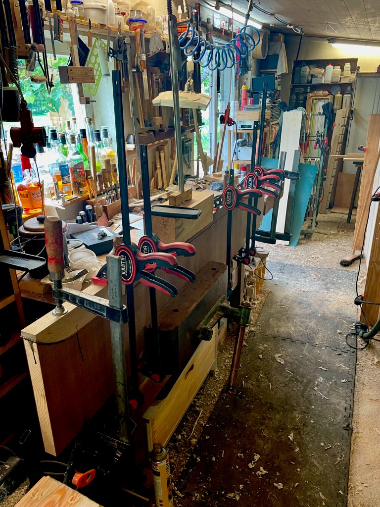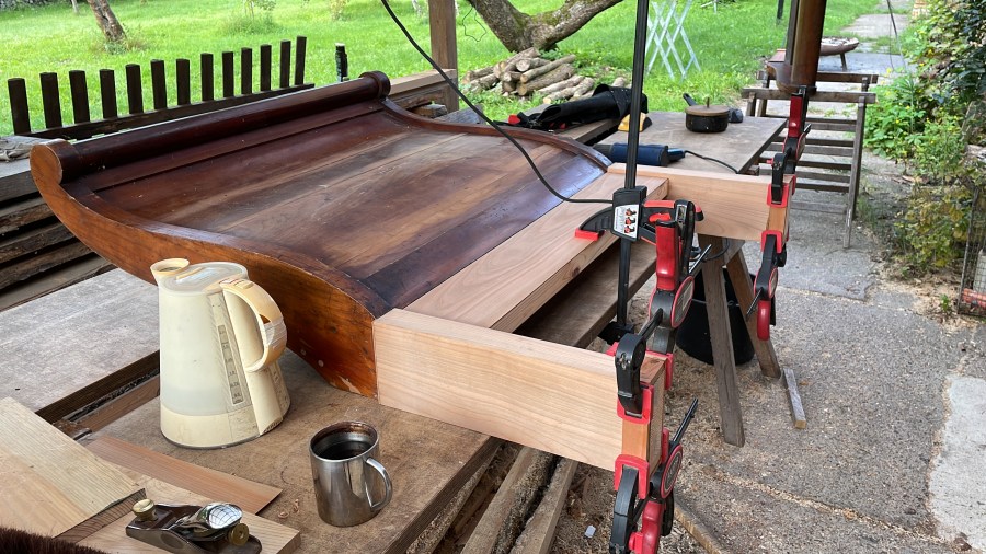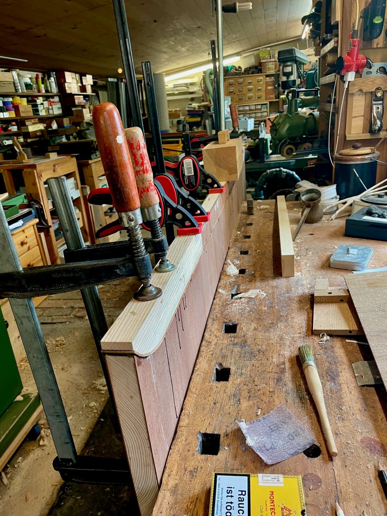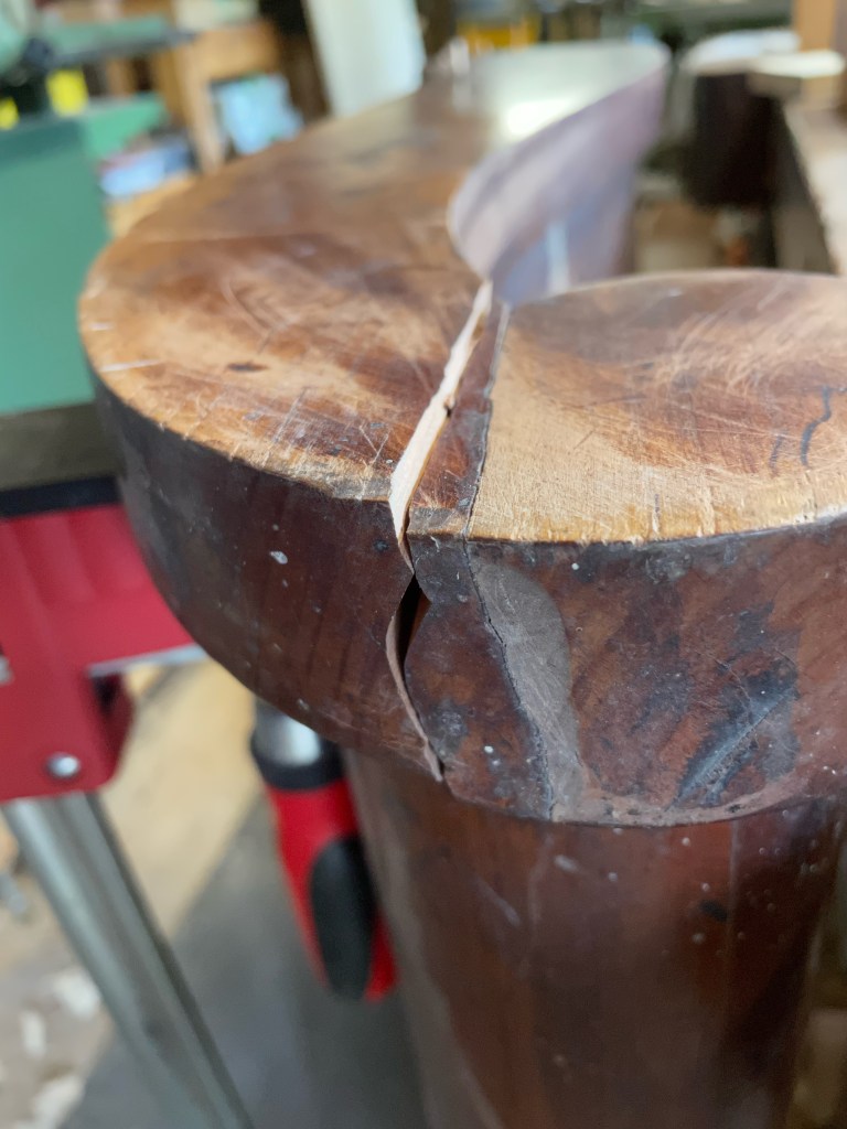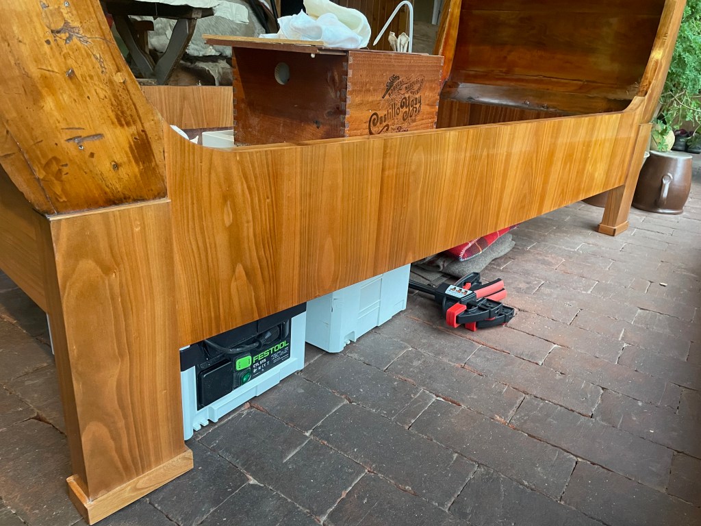An den oberen Schnecken der Seitenwangen waren etliche Risse zu verleimen. Ein paar Nägel waren auch noch heraus zu experimentieren. Dann war alles soweit vorbereitet um an die Oberflächenbearbeitung zu gehen.