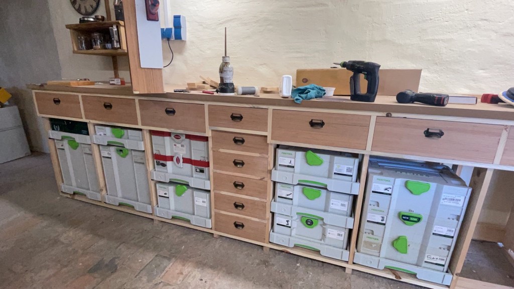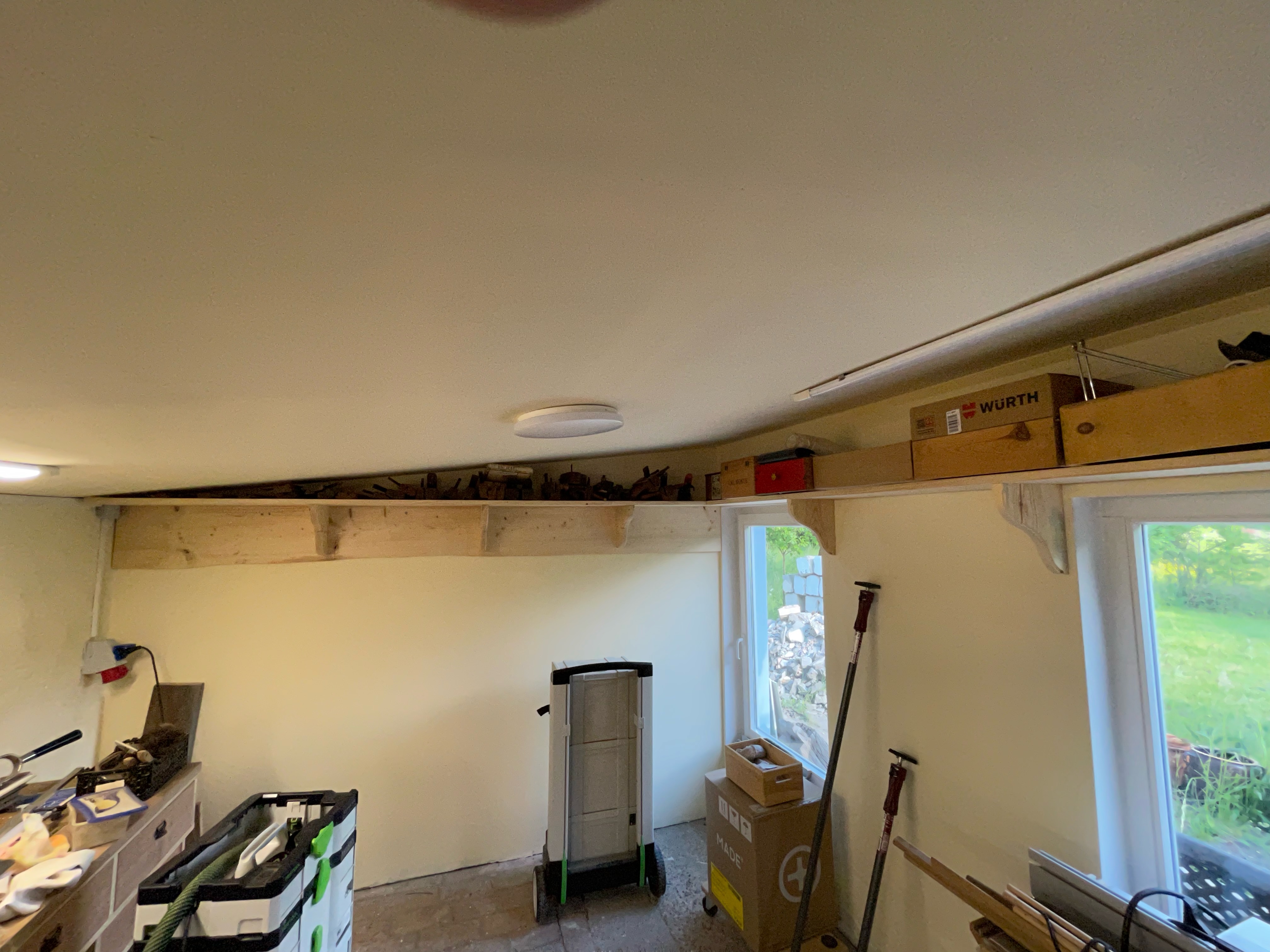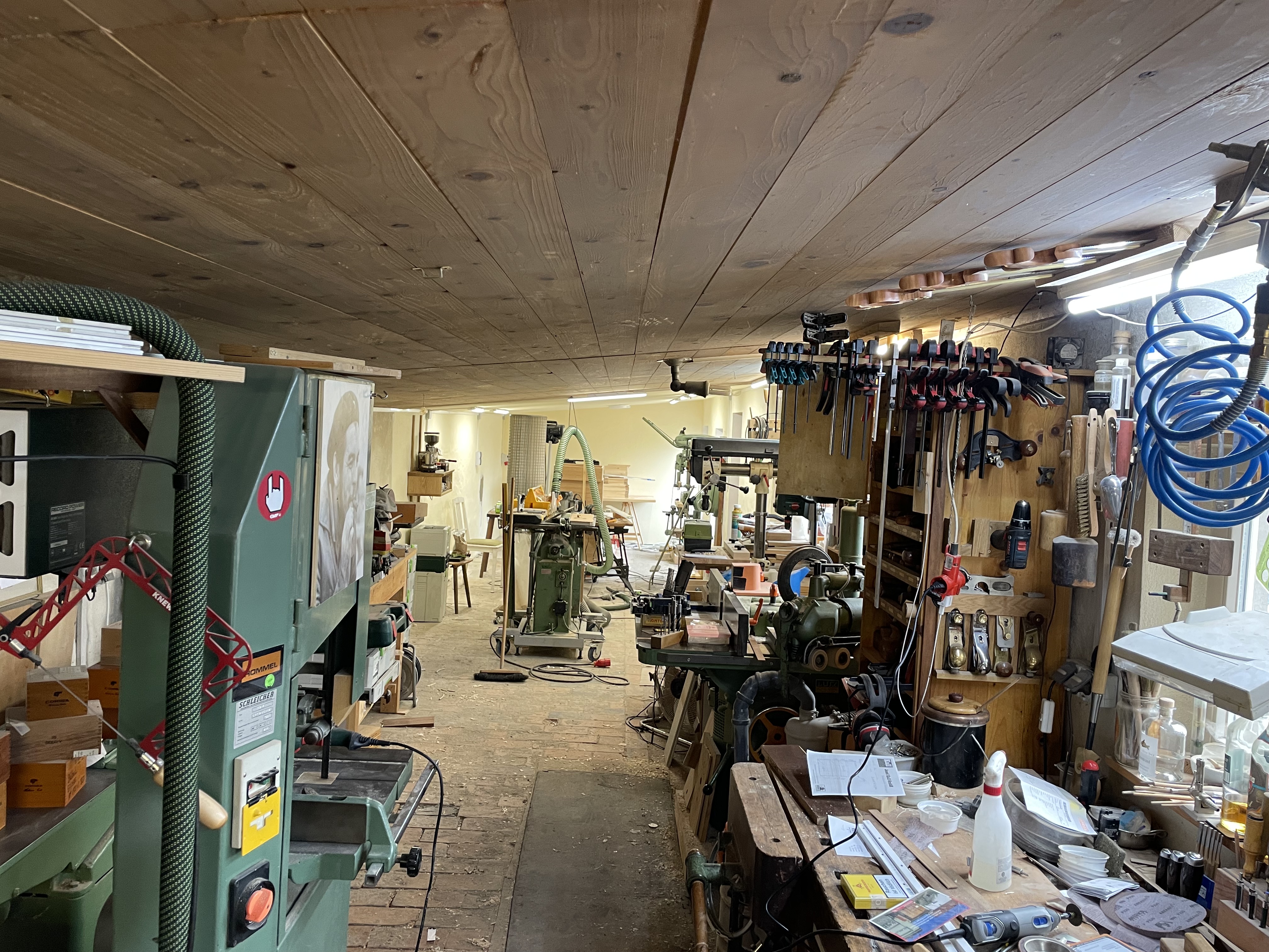 So langsam füllen sich die Wände, Die Abrichtmaschine haben wir an eine bessere Stelle gestellt, auch die Bohrmaschine, der Bullerjan und die Drechselbank bekamen einen besseren Platz. Nun konnte ich auch die Bildhauerbank in die Werkstatt intergieren.